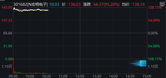 上市首日,宏明电子翻番高开,开盘价140.14元/股,涨幅101.18%。截至记者发稿股价上涨超过95%。