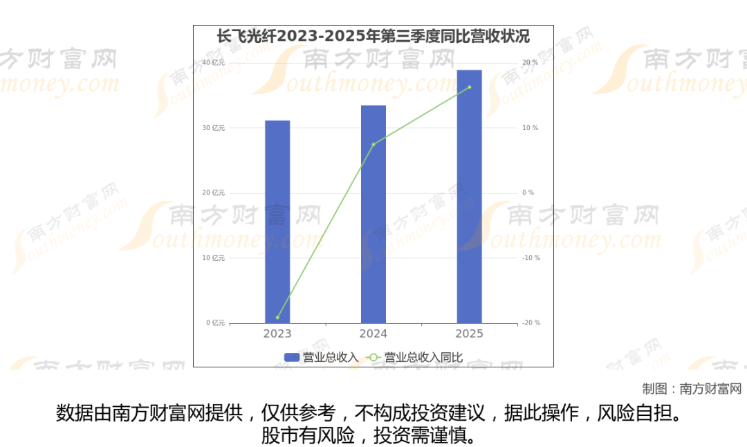 长飞光纤2025年第三季度报告显示(如上图),公司实现主营业务收入38.91亿元,较去年同期增长16.27%。