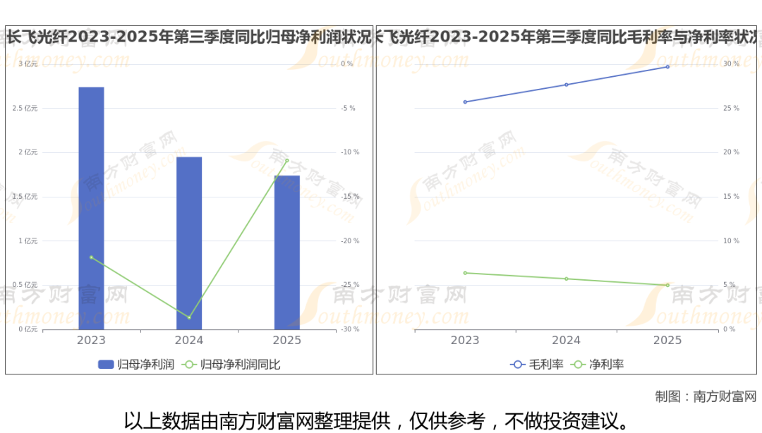 2025年第三季度季报显示,长飞光纤公司实现净利润1.74亿,同比增长-10.89%;毛利润为11.55亿,毛利率29.69%。