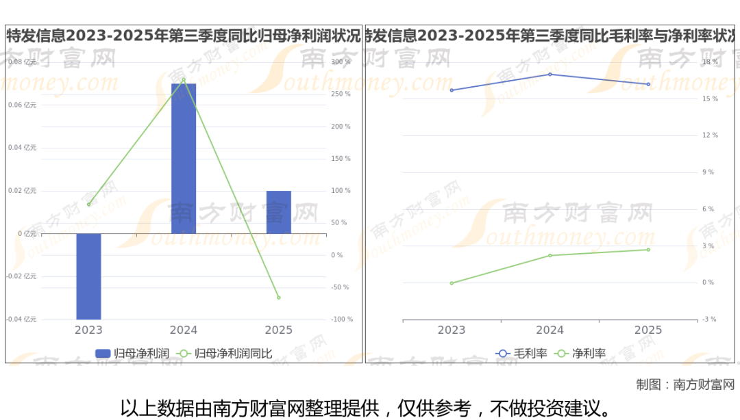 2025年第三季度季报显示,特发信息公司实现净利润239.2万,同比上年增长率为-65.9%,毛利率16.2%。