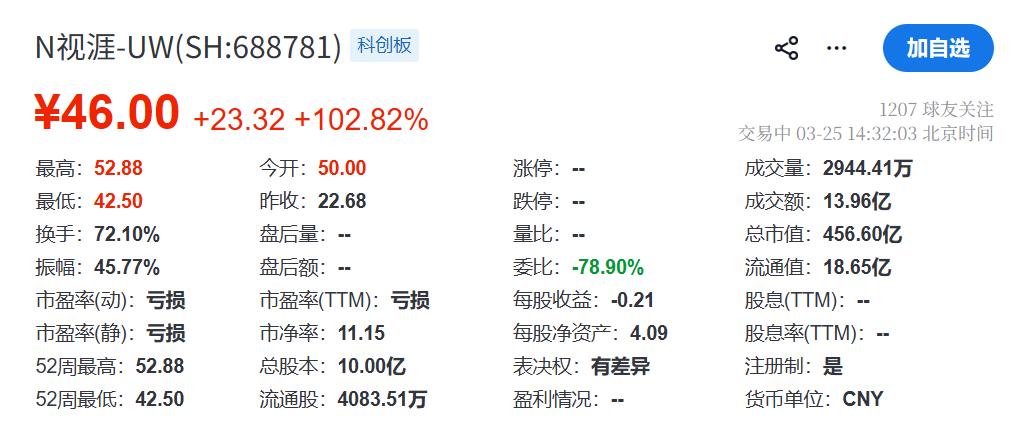 3月25日上午,视涯科技(688781.SH)在科创板挂牌上市,保荐机构为国泰海通证券。截至撰稿,股价报46元,市值达456.60亿元。