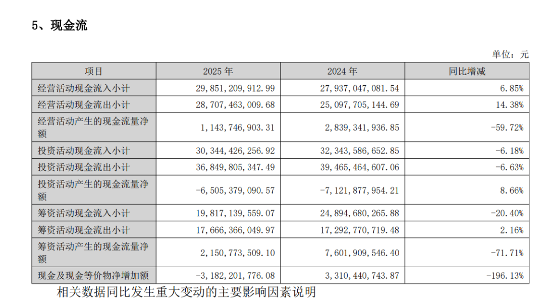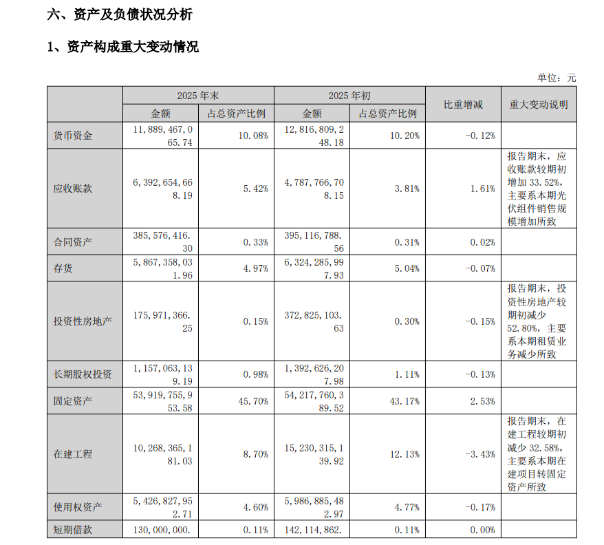 2025年,受主要产品毛利为负以及自身电池组件业务仍处拓展阶段等影响,公司实现营业收入290.50亿元,同比增长2.22%;归属于上市公司股东净利润-92.64亿元,同比减亏5.65%;经营现金流净额11.44亿元,含银行汇票的经营性现金流量净额30.85亿元。