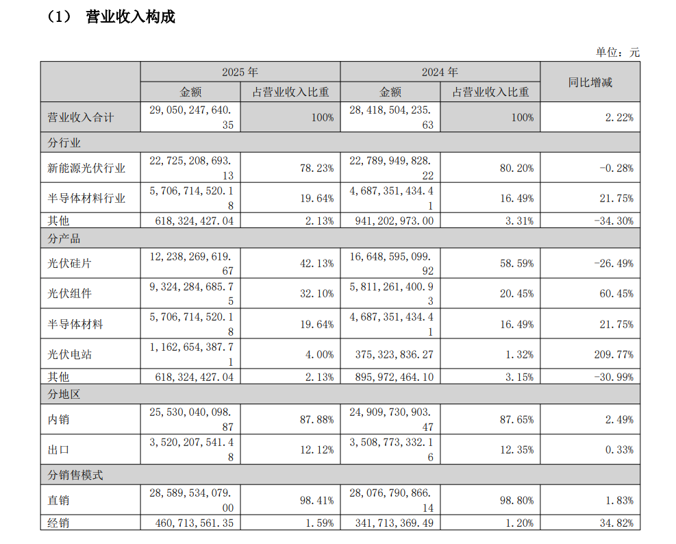 2025年,光伏行业竞争加剧驱动产品结构升级,提升高价值产品占比,G12R硅片逐步成为主流尺寸,电池组件聚焦高功率、高溢价、高壁垒市场。公司新能源光伏业务积极把握行业趋势,以市场牵引按需生产,助力供需关系修复,推动行业健康发展。报告期内,公司加速适度一体化和全球化战略落地,巩固晶体晶片业务的竞争优势,提升电池组件能力,开拓海外市场,改善经营困境。年初至报告期末,公司新能源光伏业务实现销售收入227.25亿元。