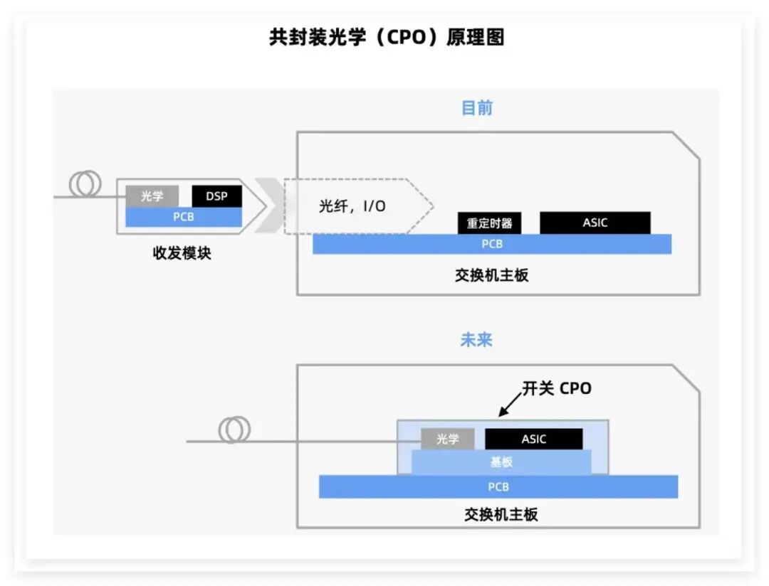 CPO通过将光引擎与电芯片共封装在同一基板或中介层上,实现芯片级集成。