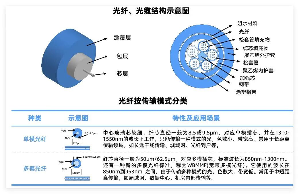 光纤分类:按光在光纤中的传输模式一般分为单模光纤和多模光纤两种类型。“模”即指光以一定角速度进入光纤后的传输路径。由于芯层直径的粗细不同,光纤中传输模式的数量也不同。单模对应直径较小的芯层,允许光用一种模式传输;多模对应直径较大的芯层,允许光用多种模式传输。