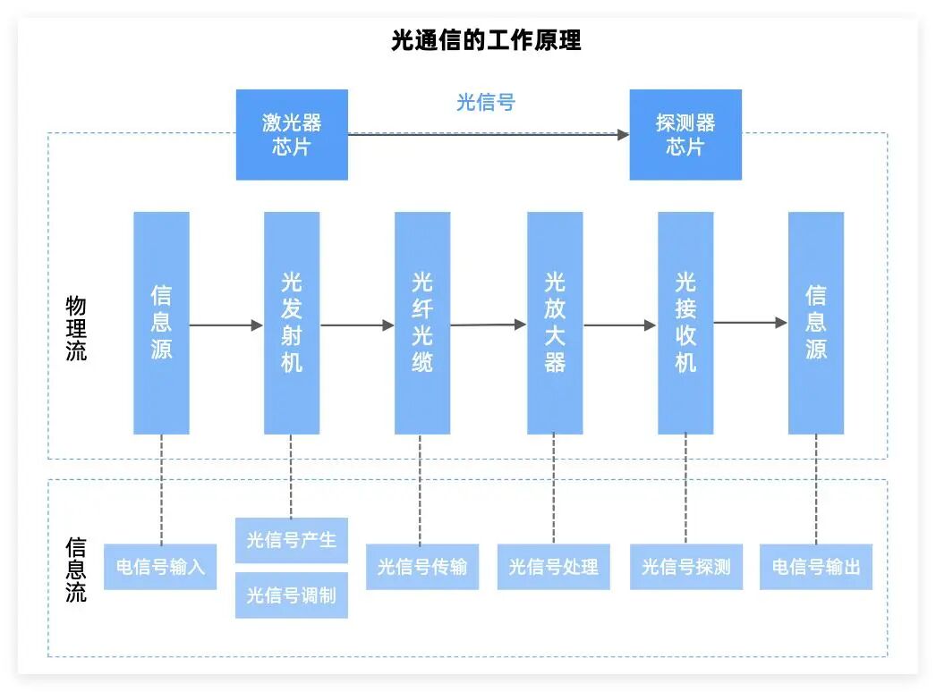 核心原理是将电信号转换为光信号,利用光的特性进行高效传输,接收端再将光信号还原为电信号完成通信过程。