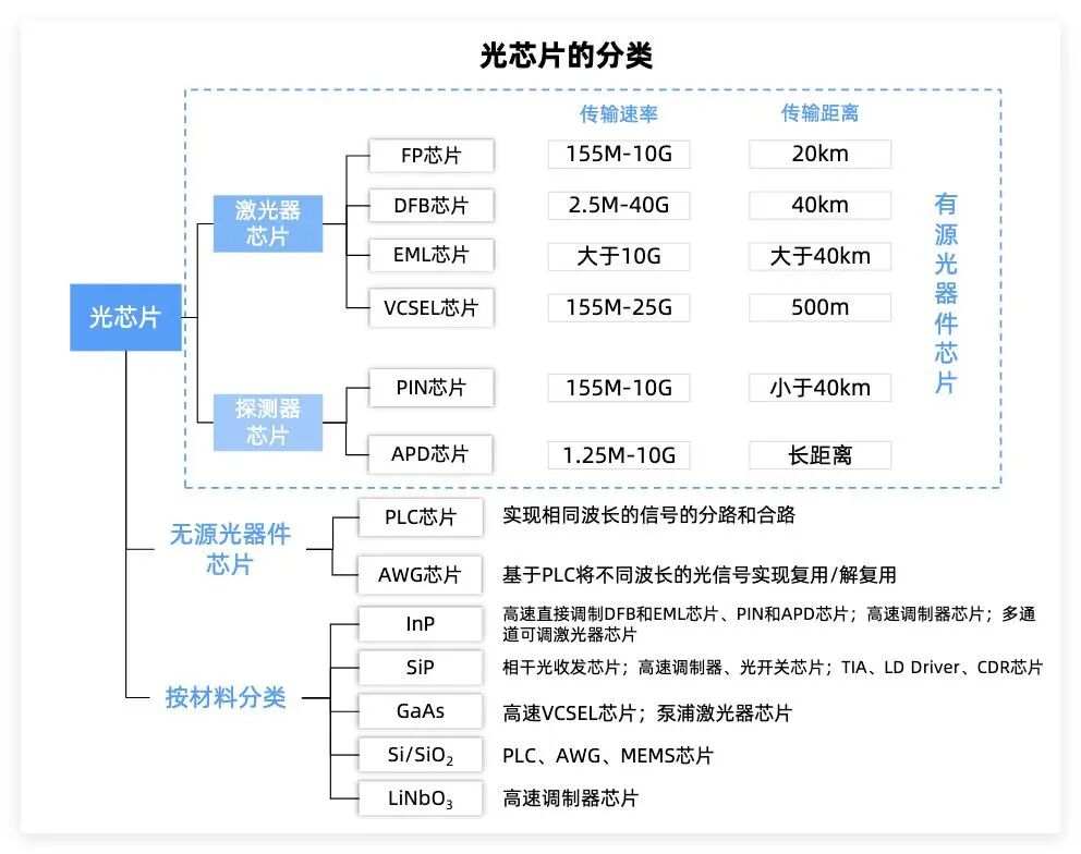 主要包括激光器芯片(发信号,电转光)、探测器芯片(收信号,光转电)等。