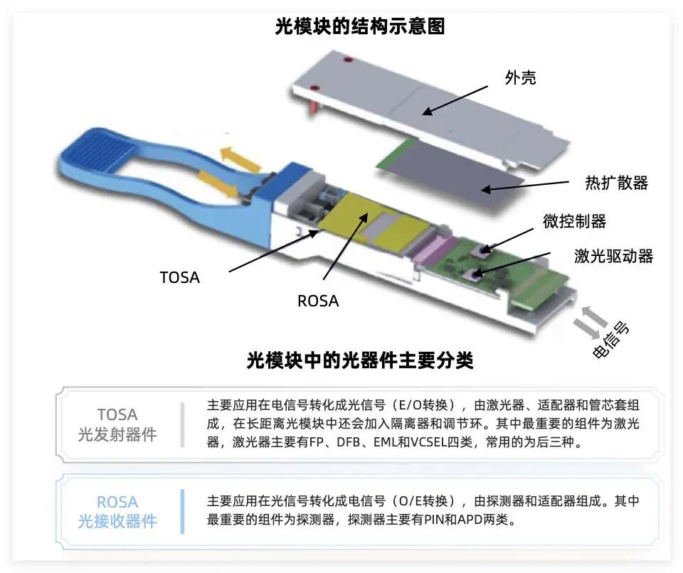 一个光模块通常由光发射器件(TOSA)、光接收器件(ROSA)、激光器芯片(LDChip)、光探测器芯片(PD Chip)、电路板(PCBA)、光纤接口、电接口等部分组成。