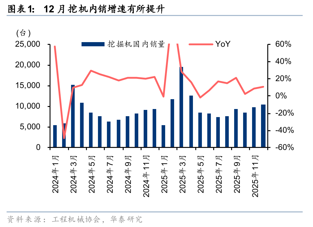据工程机械协会,12月中、小挖内销量同比增速较11月有所改善,大挖增长放缓但仍维持增长,在煤价下行背景下体现出一定的韧性。25年全年大中小挖均实现了正增长,增量更多由小挖拉动。展望未来,雅鲁藏布江下游水电工程等重点基建项目的陆续落地开工、地产的潜在复苏有望为工程机械内需复苏提供支持。12月起重机等非挖品类或延续改善趋势,11月汽车/履带起重机销量分别同比 17%/ 66%,1~11月分别同比-1%和 27%。