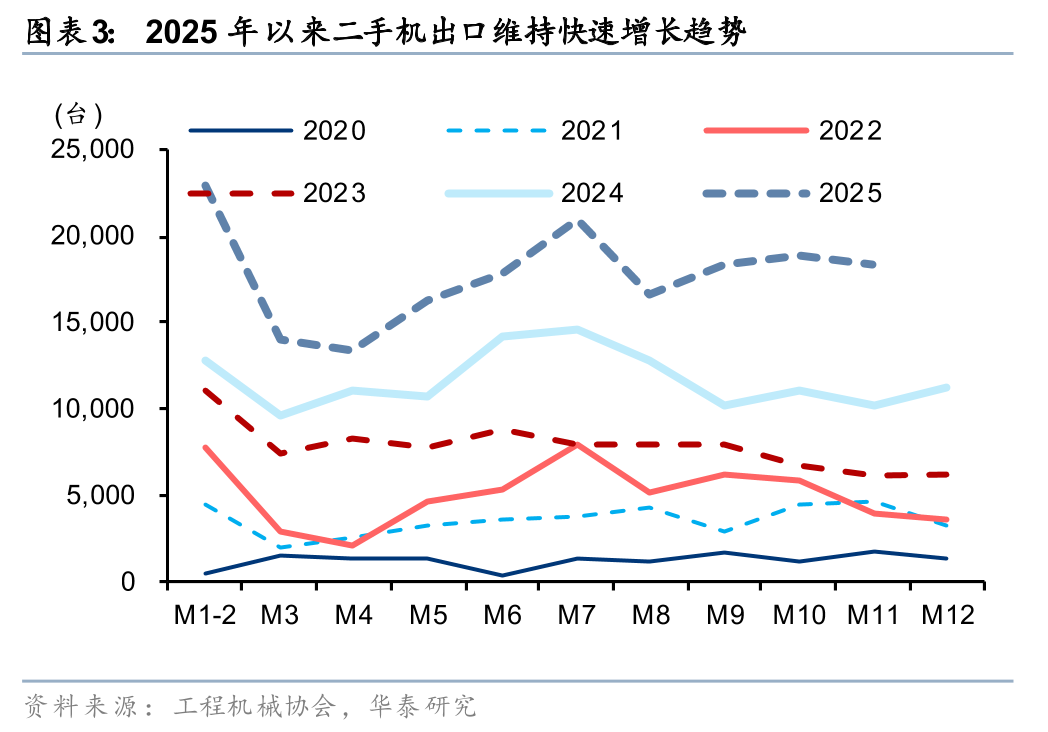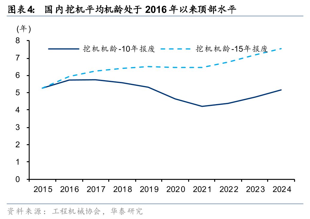 我们在1月27日发布的报告《二手机视角:工程机械出海仍在成长》中指出,2020年以后国内二手工程机械设备出口的快速增长或帮助国内存量设备出清,从而为内销提供了有力支撑。据海关总署数据,10、11月二手机出口同比增速分别达69%、80%,连续保持高速增长态势,前11月二手机出口台数同比增长52%,有效加速国内存量设备出清。当前国内挖机存量机龄仍处于2016年以来的高位区间,叠加二手机出海带来的置换空间,内需复苏有望进一步提速。