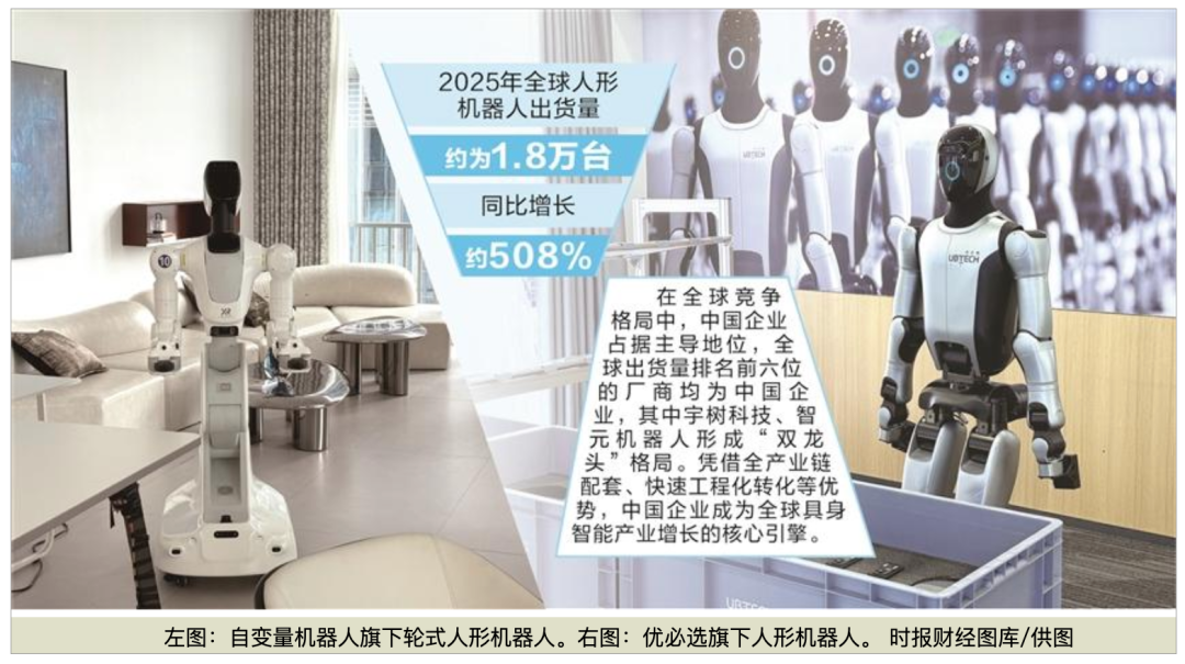 从春晚舞台上的“顶流”表演者,到车间里默默劳作的“工友”,再到公共服务场景越来越多的“咖啡师”“讲解员”,我国人形机器人产业发展可谓热火朝天。作为六大未来产业之一,我国具身智能产业已实现从实验测算到小批量交付的跨越,宇树科技、智元机器人更是以全球第一的出货量领跑行业。在各路资本蜂拥入局跑马圈地的热闹之下,具身智能产业发展仍面临核心痛点:能完成后空翻的武术表演却叠不好一件薄薄的衣服。当人形机器人能在80%的陌生环境中完成80%的语音指令,具身智能的“ChatGPT时刻”才会真正到来——宇树科技创始人兼CEO王兴兴提出的这一行业坐标,正让无数从业者夙兴夜寐,向终极战场发起冲锋。具身智能作为代表性的未来产业,在顶层设计上获得了重要的政策推力,首个全产业链标准体系于2月发布。在国家政策的引导下,各地也呈现差异化竞争态势。北京依靠人才优势主打“技术策源 场景创新”,深圳背靠完整电子产业链主打“硬件制造 场景落地”,杭州则进行精细化“全市一盘棋”空间布局。具身智能产业在2025年实现跨越式发展,其中人形机器人出货量已初具规模。知名咨询公司IDC发布的《全球人形机器人市场分析》显示,2025年全球人形机器人出货量约为1.8万台,同比增长约508%。在全球竞争格局中,中国企业占据主导地位,全球出货量排名前六位的厂商均为中国企业,其中宇树科技、智元机器人形成“双龙头”格局。凭借全产业链配套、快速工程化转化等优势,中国企业成为全球具身智能产业增长的核心引擎。以宇树科技IPO获受理为标志,具身智能在资本市场也备受追捧。据IT桔子数据,2025年具身智能赛道融资超511亿元(是前一年的3.5倍),2026年仅前三个月融资已近300亿元。资本潮涌之下,具身智能估值门槛急剧抬高,目前已有13家企业估值突破百亿元。过去的一年里,人形机器人的运动与操作能力进步迅速。机器人已能胜任武术表演、后空翻、弹钢琴、下围棋,也能在工厂搬运重物、进行上下料等工作,然而却在很多时候端不稳一杯水、捡不起一根针,甚至绕不开一把椅子。“下棋能赢世界冠军,却拧不开一瓶水。”市场不乏对具身智能这类调侃。当下,国内具身智能行业正处于从“千台交付”到“万台量产”的规模化前夕,模型泛化能力是核心瓶颈:机器人仍只能按照预设程序完成特定动作。泛化能力进步到何种程度才算真正实现具身智能的“ChatGPT时刻”?宇树科技创始人兼CEO王兴兴认为,具身智能的ChatGPT时刻,意味着机器人可通过语音或文字指令,在80%的陌生场景中顺利完成约80%的任务。“比如说,我把一台人形机器人带到一个它完全没有见过的场景,它也不认识场景里的人,我跟它说‘帮忙把这瓶水带给某人’或者‘帮忙找一支笔过来’,它能完全自主地完成这些任务,不需要提前建图,也不需要提前预设程序。”在人工智能领域,物理世界存在“莫拉维克悖论”,也就是说对人类来说简单的叠衣服、抓杯子等动作,机器人执行起来难度极大;而人类难以完成的计算、下棋等任务,机器人却能轻松应对。快思慢想研究院院长田丰向记者解释,机器人的“行走、翻跟头”本质上是一个闭环的动力学平衡与物理控制问题,而“捡针、拿易碎品”则是一个开环的、高精度的多模态感知与接触动力学问题。前者容错率高,后者一旦发力偏差0.1牛顿,鸡蛋、蛋糕、卫生纸就会损坏。“精细动作的突破必须依赖机械结构设计、高灵敏度传感网络、专用底层AI芯片以及具身大模型的系统级深度耦合,才能真正释放商业潜力。”田丰指出。为解决机器人通用泛化能力难题,2026年人形机器人行业竞争焦点正加速从“肢体”转向“大脑”,推动“认知—行动一体化”。“硬件决定了机器人能力的上限,即物理极值,而大脑(算法)则决定了其实际表现的下限,即通用泛化任务能力。”田丰指出。业内正在向机器人的“大脑”投入重金。自2025年12月至今,具身智能领域融资金额开始超越“人形”形态融资体量,资本重点押注于通用具身大脑、AI运动控制等上层智能技术。宇树科技近日披露的招股书公开文件显示,计划将20.22亿元募集资金用于智能机器人模型研发项目,重点突破具身大模型与机器人运动控制的融合技术。2026年以来,自变量机器人、银河通用等企业完成大额融资,资金均拟用于具身智能大模型和相关基础设施的研发。过去,机器人运作能力依赖预设程序,环境稍有变化其能力就可能失效,核心原因就是不理解物理世界的运行规律。宁波具身智能机器人创新中心总经理何川向记者表示,真正决定机器人价值与行业高度的是物理AI(机器人理解物理世界的能力)而非硬件。为推动具身智能走向通用劳动力时代,必须突破空间智能、物理理解、自主决策等关键能力;物理AI是让机器人具备“物理直觉”的基础技术,大模型驱动语义智能,二者合一,才是具身智能。不过,物理AI本质在于复刻物理世界规律,这一过程本身存在多重难点。其中,真实数据缺失,成为最大的痛点之一。目前行业内普遍缺乏高质量真实世界数据,尤其是工业工艺数据。优必选首席品牌官谭旻在接受证券时报记者采访时分析,只有通过大量真机实训积累的数据,才能支撑技术迭代。以优必选为例,公司通过在真实工厂场景中采集数据,针对特定工种训练模型,尽可能还原真实场景中的