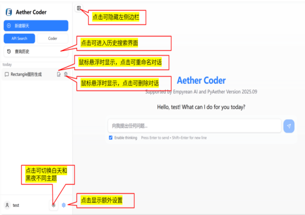 作为面向Empyrean PyAether用户的人工智能辅助工具,Aether Coder核心打造两大功能模块,分别解决开发过程中API检索与代码生成的关键问题,形成从资源查询到代码实现的一体化技术支持体系。