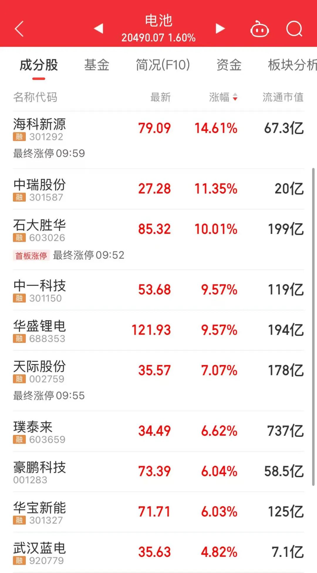 今天上午,锂电产业链表现强势,能源金属、固态电池、石墨电极等板块涨幅居前,海科新源、中瑞股份等个股大涨,宁德时代、天赐材料、赣锋锂业等龙头股上涨。