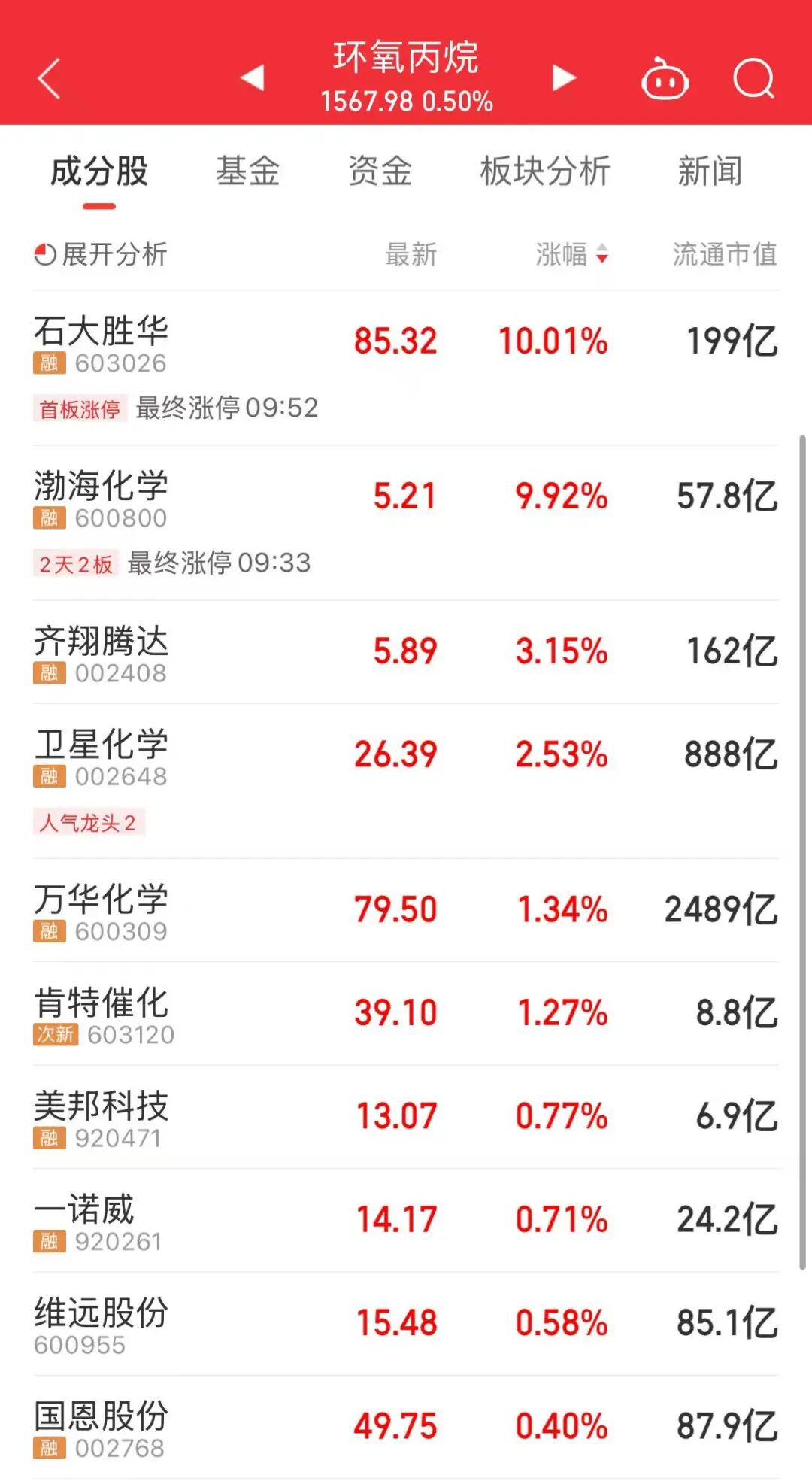 今天上午,化工股表现活跃,环氧丙烷、氟化工等板块上涨,石大胜华、渤海化学涨停。