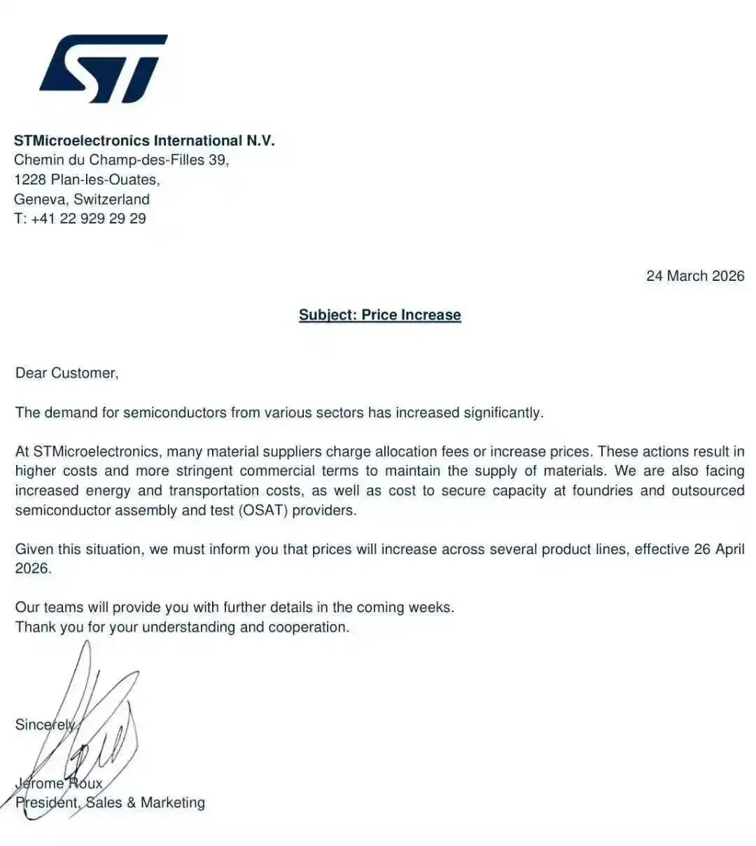意法半导体称,鉴于各行业对半导体的需求显著增长,而意法半导体的许多材料供应商收取分配费或上调价格,这些行为导致成本上升,公司还面临着能源和运输成本的增加,以及为确保晶圆厂和外包半导体组装与测试(OSAT)供应商产能而产生的成本,公司将上调部分产品价格。