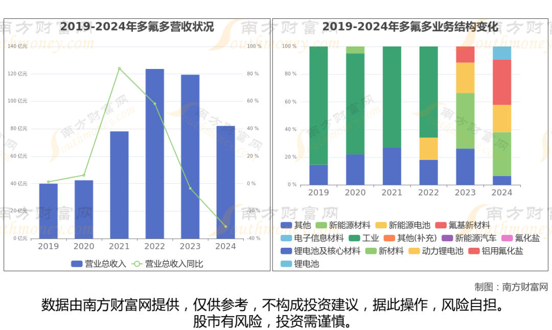 (如上图)多氟多2024年全年营业收入为82.07亿,同比增长-31.25%,近五年复合年增长率17.92%。