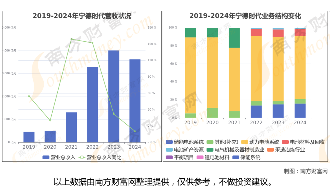 宁德时代财务数据显示(如上图): 2024年实现营业总收入 3620.13亿,同比增长-9.7%。近五年复合增长率(CAGR)为63.77%。