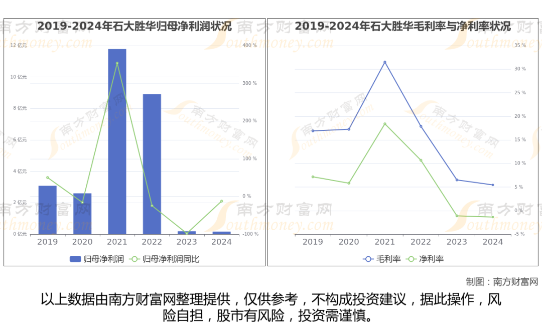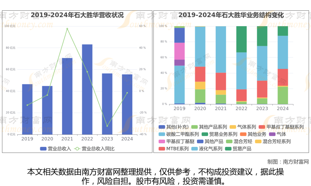 数据显示(如上图),石大胜华2024年营业收入为55.47亿,同比增长-1.56%,近5年复合年增长率5.51%。