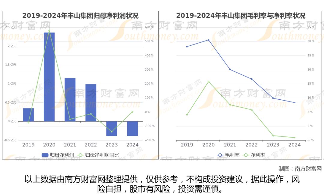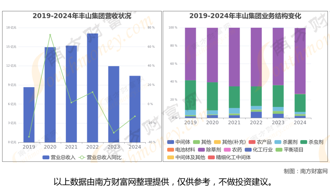 (如上图)2024年丰山集团公司营业总收入为10.44亿,同比增长-12.76%,近5年复合增长率为-8.58%。