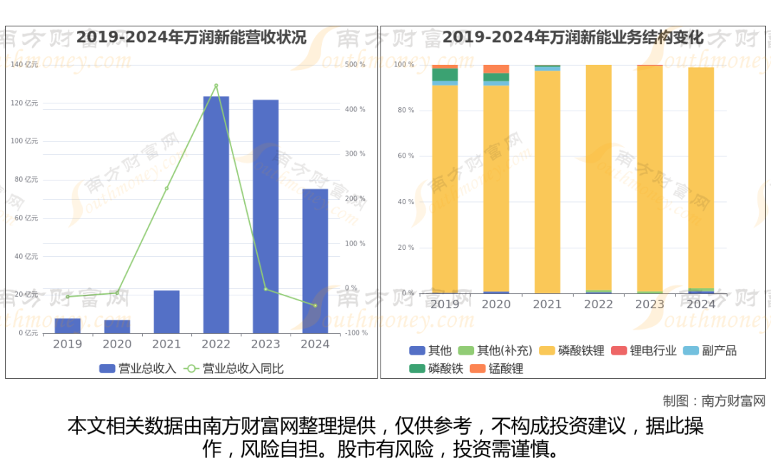 万润新能年报数据显示(如上图),2024年实现营业总收入75.23亿,同比增长-38.21%,近5年复合年增长率81.81%。