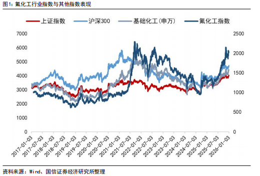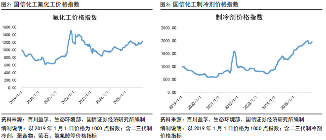 据我们编制的国信化工价格指数,截至2025年12月30日,国信化工氟化工价格指数、国信化工制冷剂价格指数分别报1233.91、1954.54点,分别较11月底 2.86%、 2.51%,12月制冷剂、萤石粉、无水氢氟酸均价均有不同程度上涨。