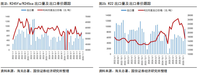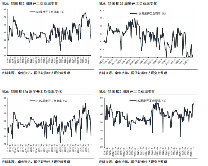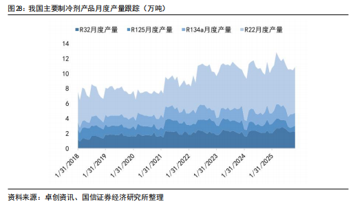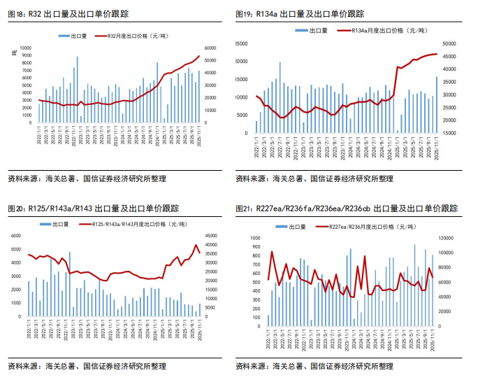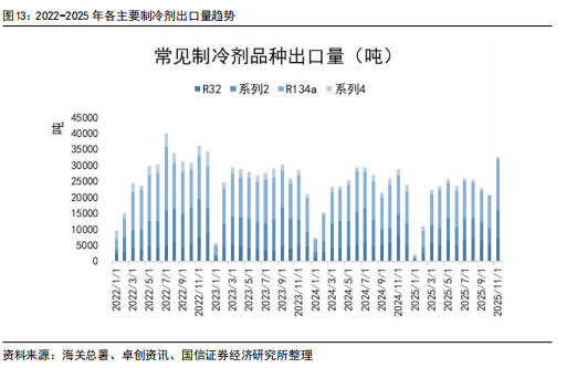 2025年1-11月,R22出口5.90万吨,同比下降21%;R32出口5.84万吨,同比增长12%;R134a出口10.8万吨,同比下降6%。从出口数据来看,制冷剂海外需求持续增长以R32为主,R22受配额削减影响,同比下滑为正常趋势。从11月数据来看:R22同比增长36%,R32同比下滑13%,R134a同比增长31%,R125/143系列同比下滑54%。
