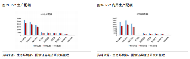 根据《2026年度消耗臭氧层物质生产、 使用配额核发表》,2026年我国二代制冷剂生产配额总量为15.14万吨,相较2025年减少1.21万吨,其中内用配额减少0.63万吨,内用配额削减占此次削减的52%。细分产品来看,R22生产配额为14.61万吨,相比2025年削减3005吨,同比削减2.02%,内用配额为7.79万吨,相比2025年削减2914吨,同比削减3.60%;R142b生产配额与内用配额与2025年保持一致;R141b配额清零。在空调维修市场需求端的支撑下,2026年R22供需或将持续改善。