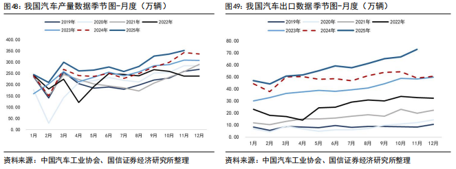 2025年我国汽车出口增长的势头仍在延续。据中国汽车工业协会数据,2023年,我国汽车产销量分别达3016.1万辆和3009.4万辆,同比分别增长11.6%和12%,年产销量双双创历史新高。2023年电动化和智能化的浪潮等助推汽车行业稳定增长,我国成为全球最大汽车出口国。据中汽协数据,2024年全年,汽车产销累计完成3128.2万辆和3143.6万辆,同比分别增长4.5%和4.8%。2025年1-11月,汽车产销量分别为3123.1万辆和3112.7万辆,分别同比增长10.8%和11.4%。海外市场方面,2024全年,汽车整体出口达到584.7万辆,同比增长20.5%。2025年1-11月,汽车整体出口为631.0万辆,同比增长18.2%。
