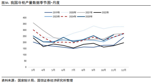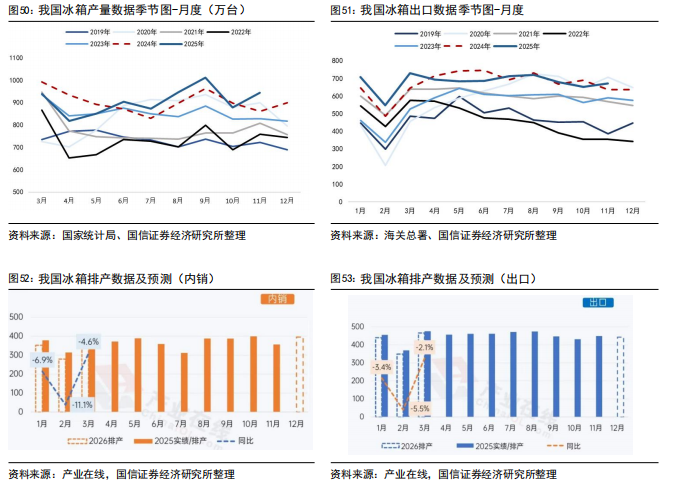 冰箱:根据产业在线,2025年初受企业备货、国补政策延续影响,2025年一季度整体排产延续增长趋势。5-6月排产受五一促销叠加618电商大促,终端销售环比改善,消费者需求有效激活。随着618大促结束,叠加传统淡季消费动能不足,三季度排产呈现下行趋势。四季度多地补贴政策频繁调整,终端市场需求受到抑制,叠加2024年四季度国补政策下内销高基数,今年四季度冰箱内销整体呈逐步下行趋势。出口方面,2024年冰箱出口已经连续两年实现双位数增长,创下历史最高值。在历史基数较高的压力下,叠加海外传统消费区库存压力上升,欧洲补库接近尾声,2025年冰箱出口压力较大,2025年一季度出口主要来自亚洲、拉美、非洲等新兴市场;二季度受美国加征关税影响,冰箱出口进入下行通道,部分企业暂停了输美业务,并转移订单至海外工厂。三季度出口区域出现分化:欧美等传统市场表现疲软,非洲、拉美等新兴市场成为拉动出口增长的主力。预计四季度冰箱出口排产延续震荡走势。根据海关总署,2025年1-11月,我国冰箱累计出口7490万台,同比 1.2%。根据产业在线预测,2026年1月冰箱内销排产352万台,较去年实绩下降6.9%;出口排产440万台,较去年实绩下降3.4%。