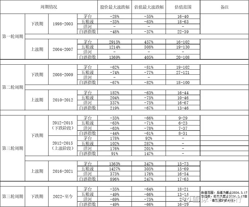 一、白酒四轮周期主要白酒企业及行业指数估值、股价涨跌区间(见下表)
