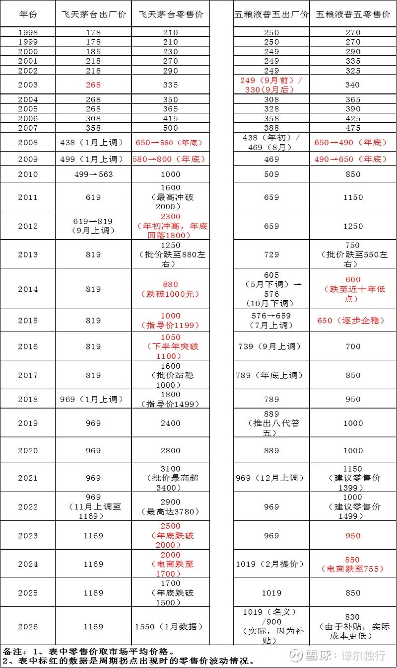 因此,我们就来看茅台、五粮液各自核心产品零售价变动与白酒周期的相关性数据(见下表)。