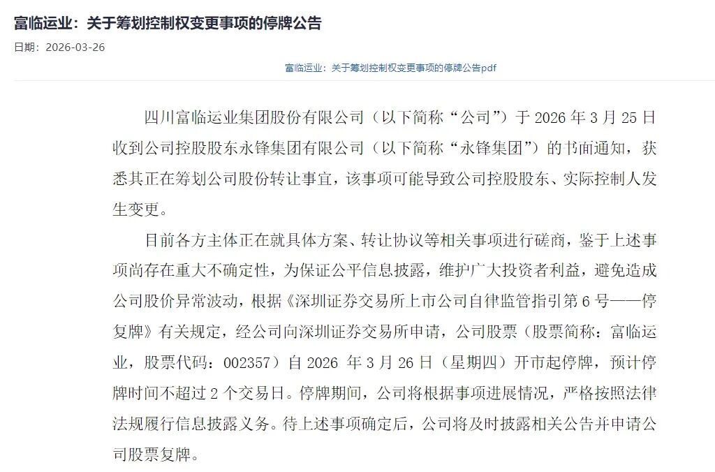 3月25日晚间,富临运业发布公告称,公司于当天收到控股股东永锋集团有限公司的书面通知,获悉其正在筹划公司股份转让事宜,该事项可能导致公司控股股东、实际控制人发生变更。