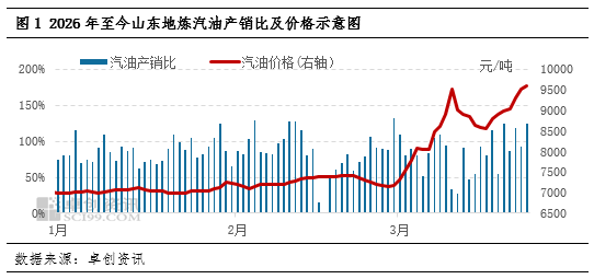 汽油方面,供应方面,部分炼厂降负运行,汽油供应减少,支撑市场。需求方面,居民驾车继续通勤为主,本周在零售价格上调前,居民集中加油,汽油消费出现短时好转。终端受“买涨”情绪影响,采购备货较为积极,近一周山东汽油市场成交活跃,山东地炼汽油车单产销比均值102%,较前一周上涨41个百分点,超越平衡线。价格方面,近一周原油多数时间表现强势,加之汽油市场成交活跃,山东地炼汽油价格上涨为主,截至3月23日,山东地炼92#汽油均价9609元/吨,较前一周同期上涨1051元/吨。