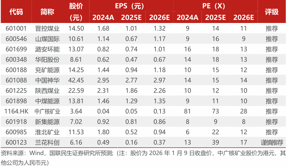 供给端双重驱动,煤价重回上行通道。国内方面,据Mysteel消息,近期榆林市将前期纳入核增产能范围的52座煤矿中的26处调出保供名单,涉及核减产能规模1900万吨。2021年保供期间核增的3亿吨产能中,有2亿吨尚未完成产能置换及环评审批手续,后续存在产能核减风险。进口方面,印尼能矿部长近期表示,2025年印尼煤炭产量为7.9亿吨,并预计2026年印尼政府将批准煤炭生产额度6亿吨左右,大幅低于2025年7.397亿吨的生产目标,也明显低于2025年11月份“产量保持在7亿吨以下”的预期。我们认为,当前产能核减已开启,进口亦有望进一步下降,煤炭供给减少势头加剧。前期受暖冬影响,电厂日耗低迷,煤价下跌,库存累积。元旦假期后,港口库存快速下降,价格出现反弹,除价格倒挂外,更多是由于产量已经开始出现下滑,导致到港口量持续低迷,库存被动减少。展望后市,供给收缩力度加强并回到常态化监管下,煤价有望回到 2023-2024 年供需基本平衡状态,价格回升至750-1000元/吨区间季节性震荡运行。板块方面,供需改善,现货比例高、资产负债表改善标的占优,同时山西省2024年已完成超产治理,受本轮“限超产”影响最小,建议关注山西标的。