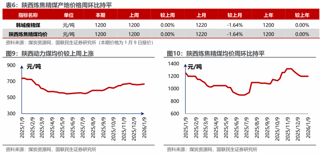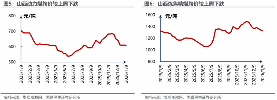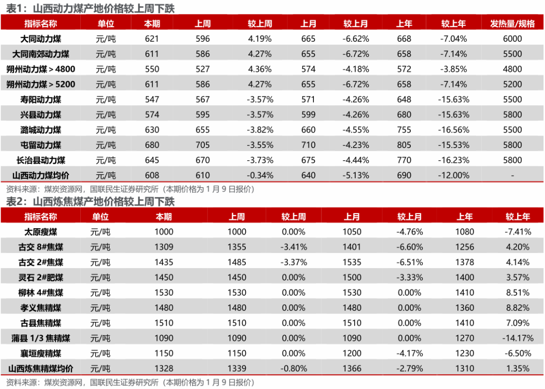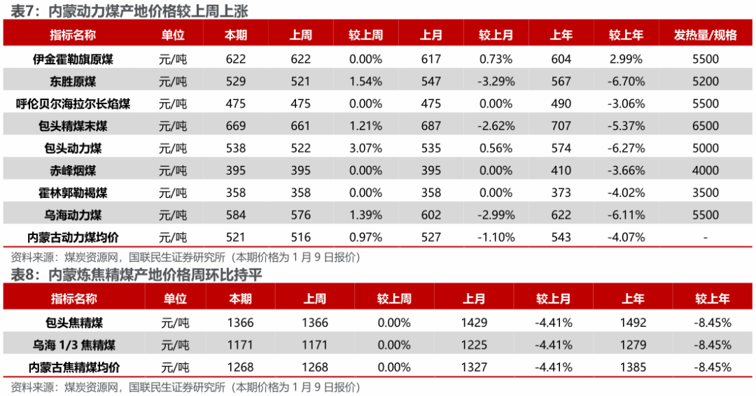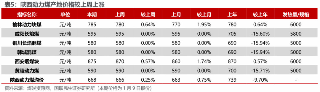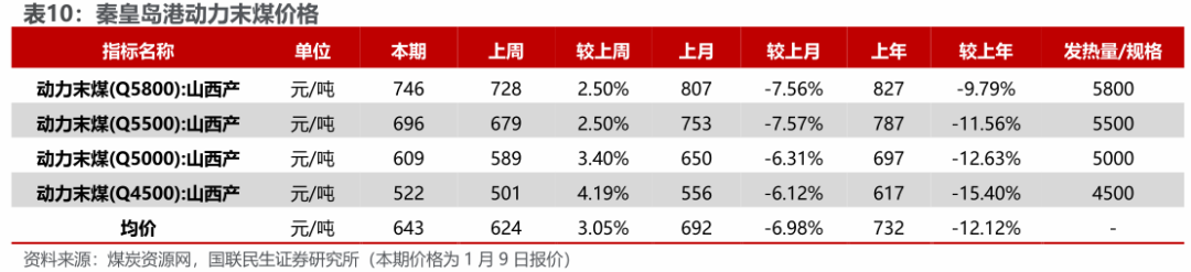 港口及产地煤价上涨。煤炭资源网数据显示,截至1月9日,秦皇岛港Q5500动力煤市场价报收于696元/吨,周环比上涨17元/吨。产地方面,据煤炭资源网数据,山西大同地区Q5500报收于581元/吨,周环比上涨25元/吨;陕西榆林地区Q5800指数报收于595元/吨,周环比上涨14元/吨;内蒙古鄂尔多斯Q5500报收于534元/吨,周环比上涨8元/吨。