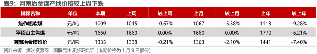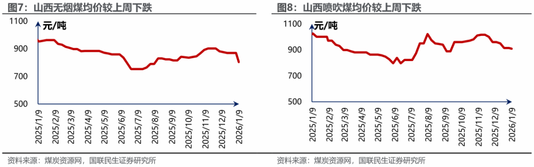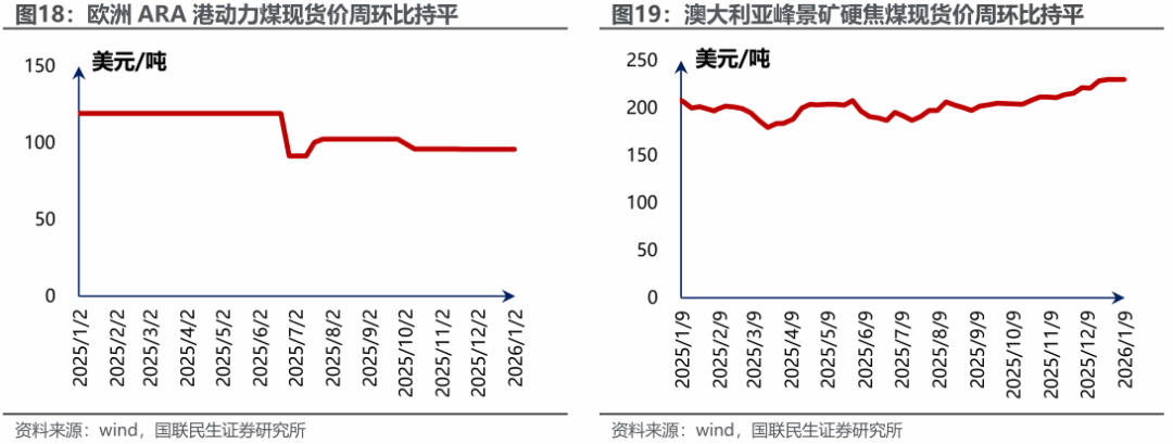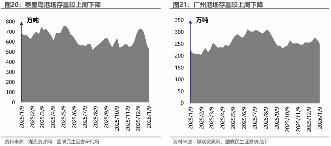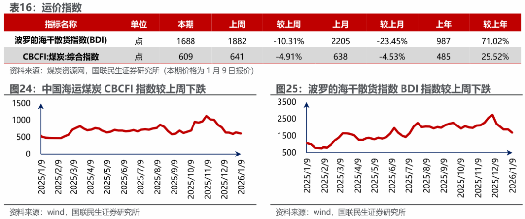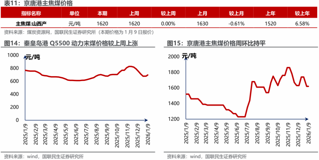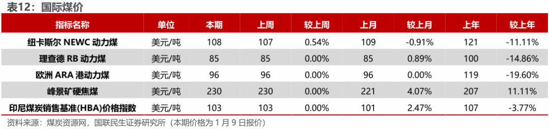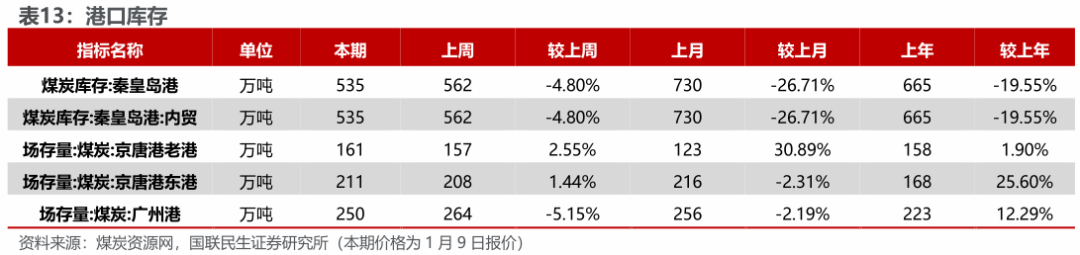 大秦线运量环比提升,北方港库存环比去化明显。本周大秦线周内日均运量环比上升7.2%至93.9万吨;唐呼线周内日均运量环比上升3.3%至18.7万吨。截至1月9日,北方港口库存2652万吨,周环比减少142万吨(-5.1%),同比增加315万吨( 13.5%)。