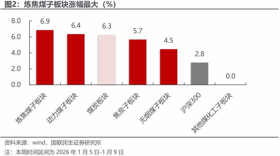 截至1月9日,中信煤炭板块周涨幅6.3%,沪深300周涨幅2.8%。各子板块中,炼焦煤子板块涨幅最大,涨幅6.9%;其他煤化工子板块涨幅最小,周环比持平。