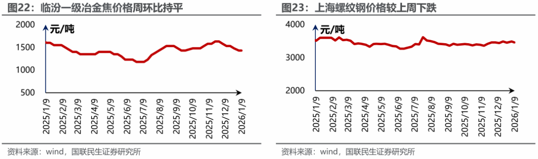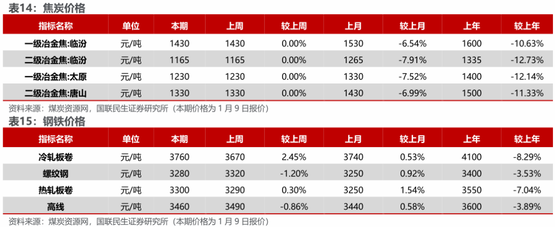 焦炭四轮降价落地。据Wind数据,截至1月9日,唐山二级冶金焦市场价报收于1330元/吨,周环比下跌50元/吨;临汾二级冶金焦报收于1165元/吨,周环比下跌50元/吨。港口方面,1月9日天津港一级冶金焦价格为1560元/吨,周环比下跌50元/吨。