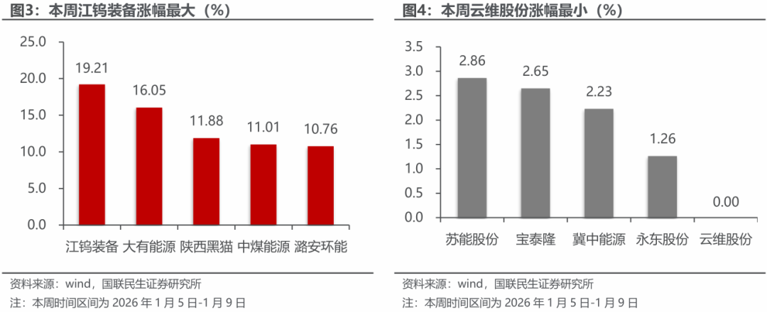 本周江钨装备涨幅最大。截至1月9日,煤炭行业中,公司周涨幅前5位分别为:江钨装备上涨19.21%,大有能源上涨16.05%,陕西黑猫上涨11.88%,中煤能源上涨11.01%,潞安环能上涨10.76%。
