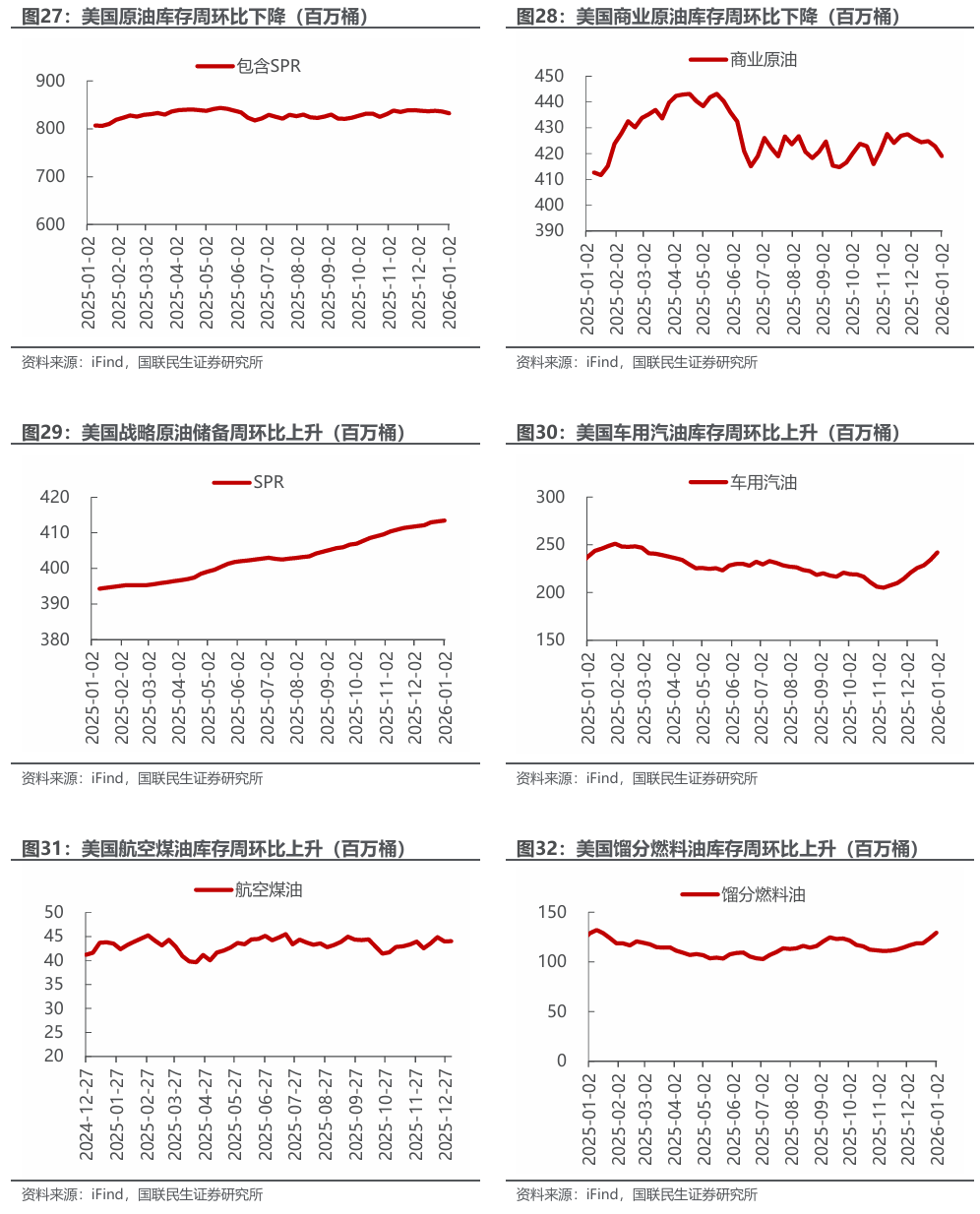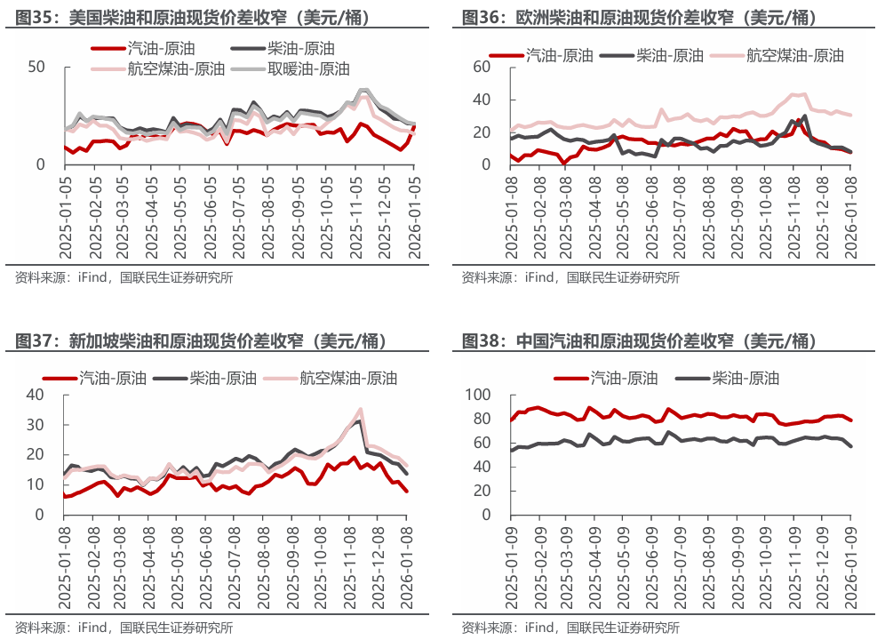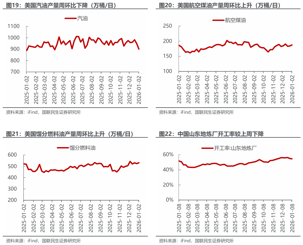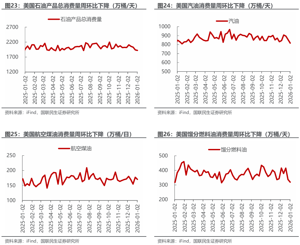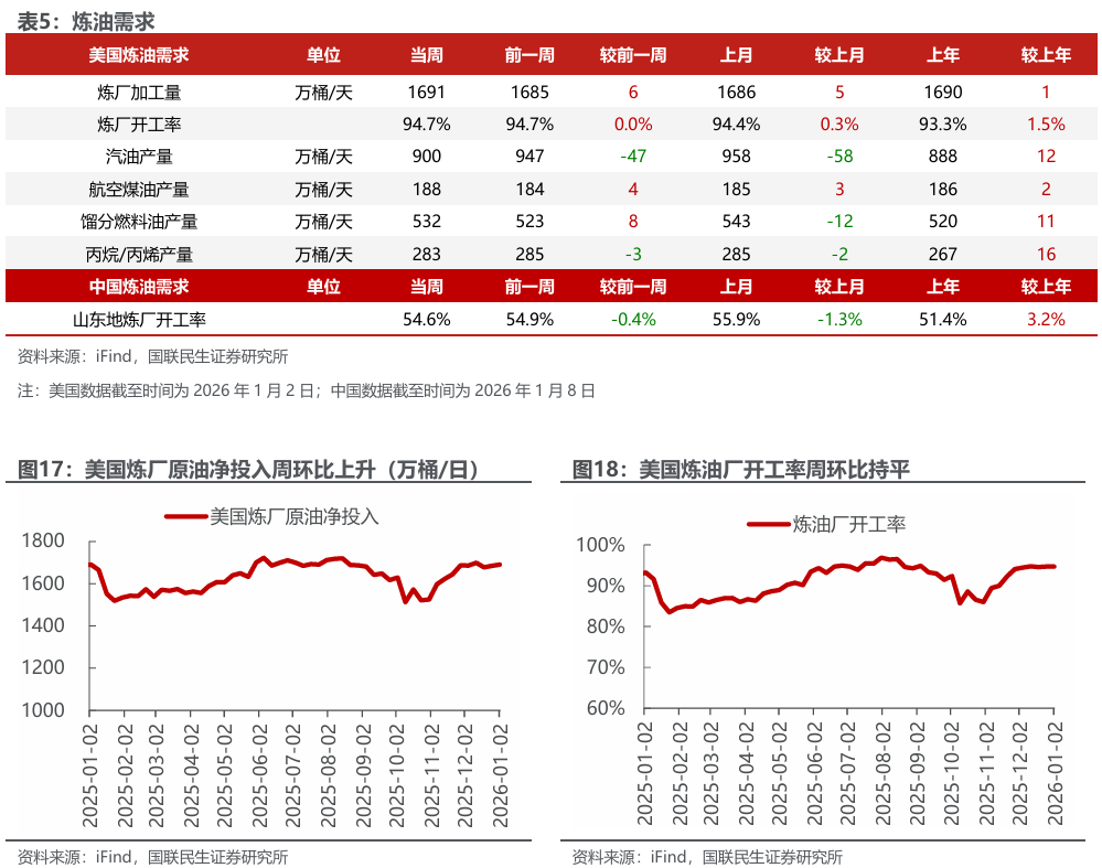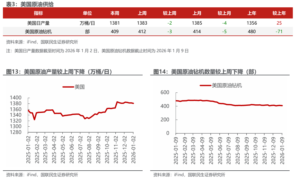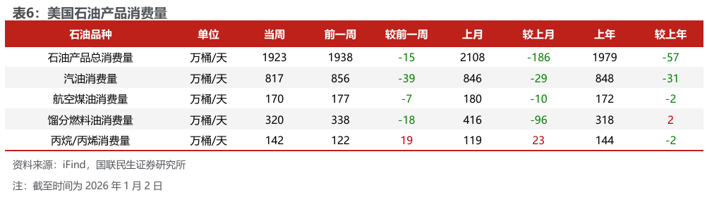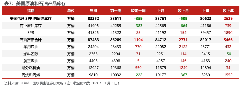 美国原油产量下降,炼油厂日加工量上升。截至2026年1月2日,1)原油方面,美国原油产量1381万桶/日,周环比-2万桶/日。2)成品油方面,美国炼油厂日加工量1691万桶/日,周环比 6万桶/日;炼厂开工率94.7%,周环比持平;汽油/航空煤油/馏分燃料油产量分别为900/188/532万桶/日,周环比-47/ 4/ 8万桶/日。