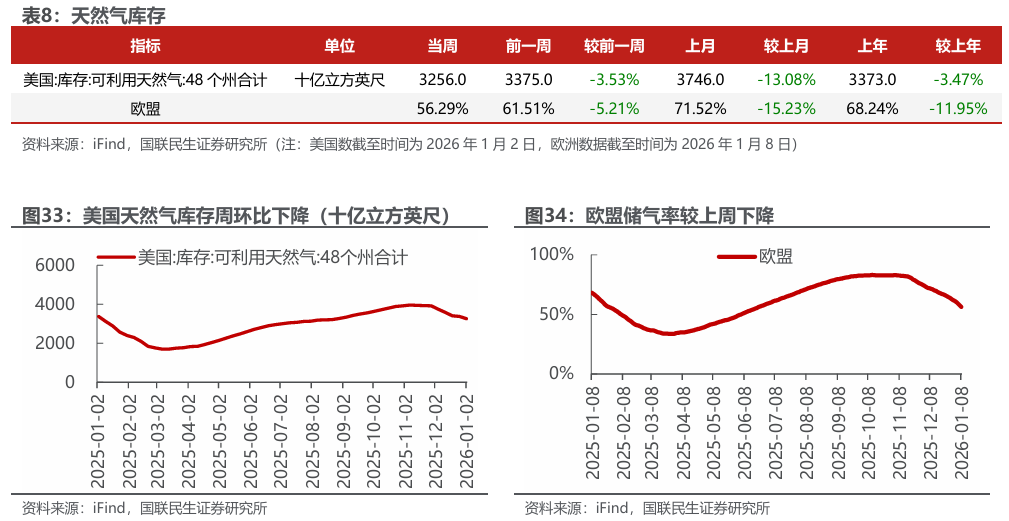 欧盟储气率下降。截至2026年1月8日,欧盟储气率为56.29%,较上周-5.21pct。