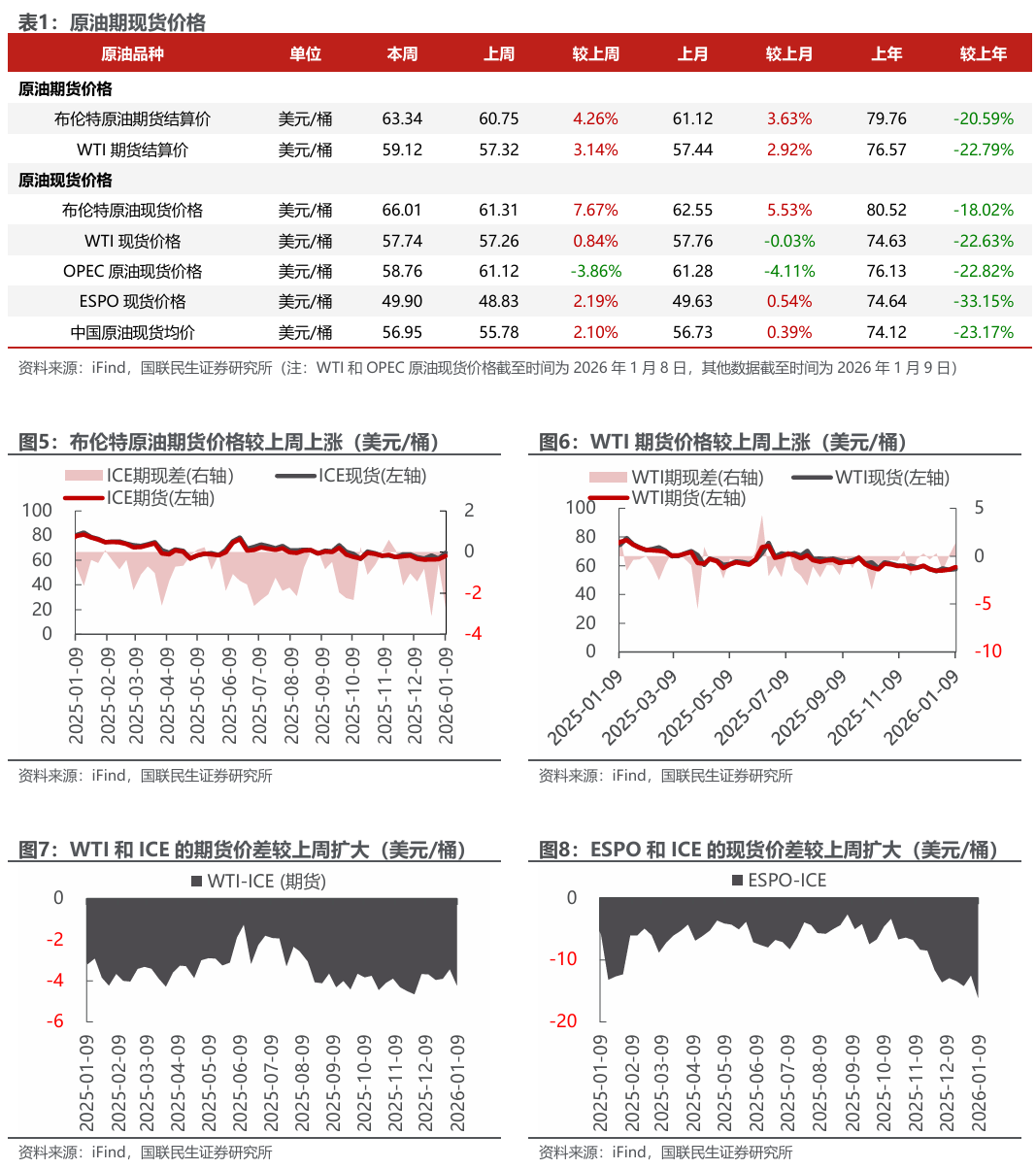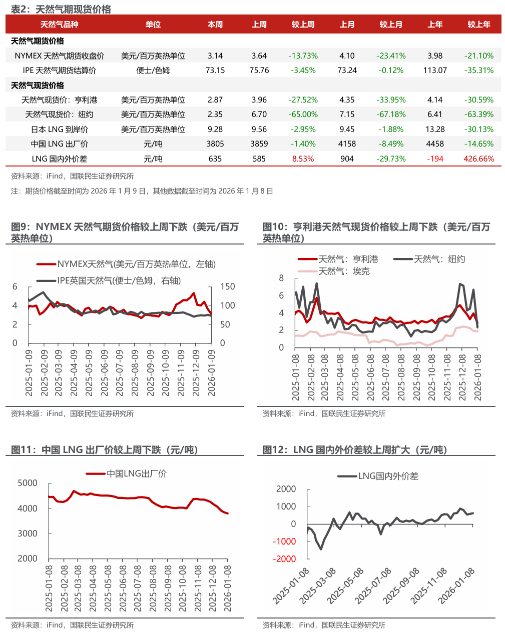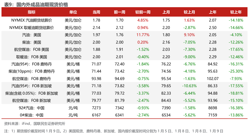 美元指数上升;布油价格上涨;东北亚LNG到岸价格下跌。截至2026年1月9日,美元指数收于99.14,周环比 0.68个百分点。1)原油方面,布伦特原油期货结算价为63.34美元/桶,周环比 4.26%;WTI期货结算价为59.12美元/桶,周环比 3.14%。2)天然气方面,NYMEX天然气期货收盘价为3.14美元/百万英热单位,周环比-13.73%;截至2026年1月8日,东北亚LNG到岸价格为9.28美元/百万英热,周环比-2.95%。