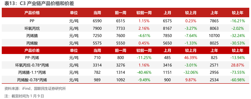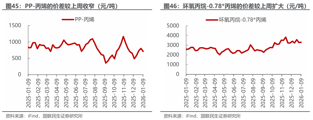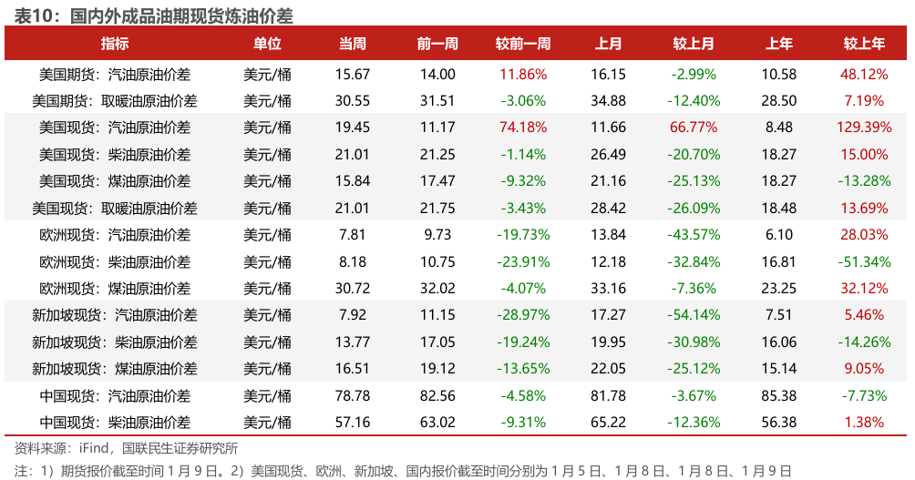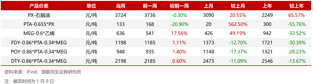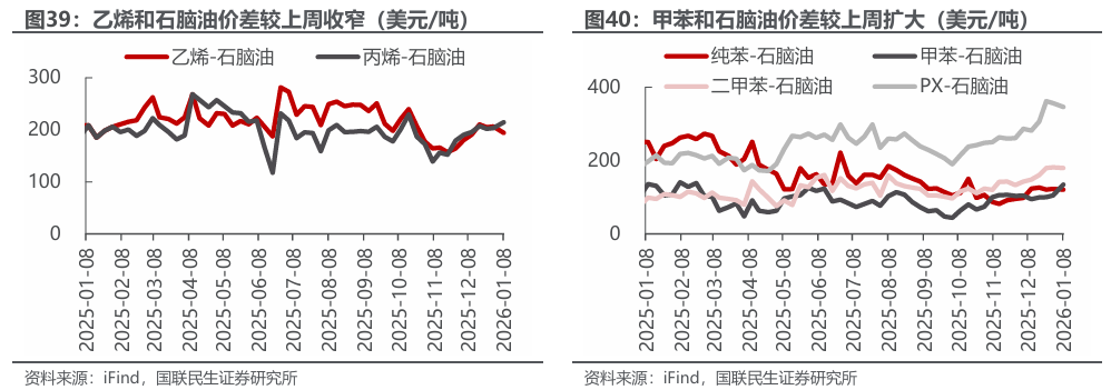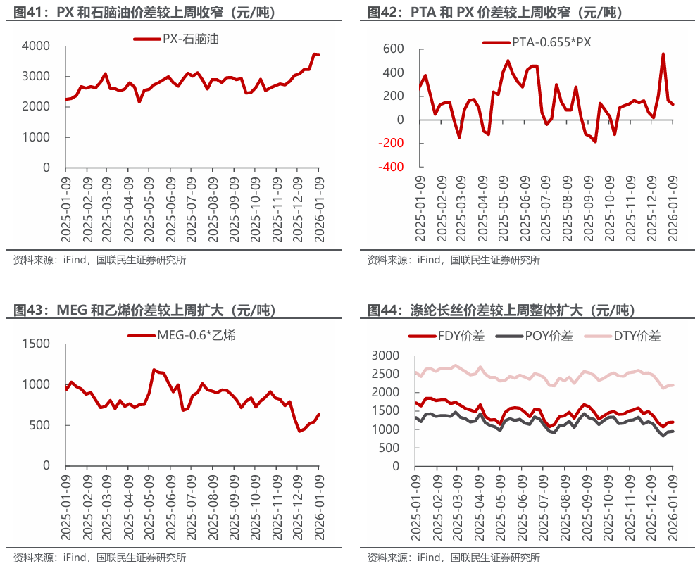 汽油价差扩大,涤纶长丝价差扩大。截至2026年1月9日,1)炼油板块,NYMEX汽油和取暖油期货结算价1.78/2.14美元/加仑,周环比 4.85%/ 0.94%,和WTI期货结算价差为15.67/30.55美元/桶,周环比 11.86%/-3.06%。2)截至2026年1月8日,化工板块,乙烯/丙烯/甲苯和石脑油价差分别为194/214/134美元/吨,较上周变化-5.87%/ 5.35%/ 28.02%;截至2026年1月9日,FDY/POY/DTY价差为1198/948/2198元/吨,较上周变化 1.11%/ 1.40%/ 0.60%。