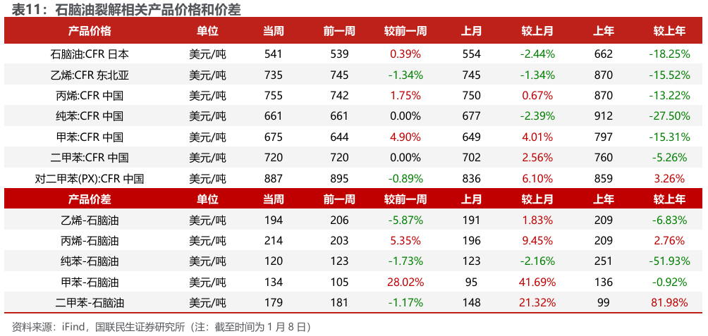 炼化产品价格和价差表现