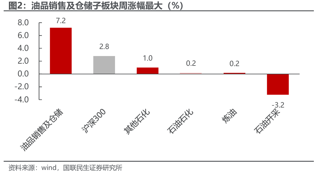 截至1月9日,本周沪深300上涨2.8%,中信石油石化板块上涨0.2%。各子板块中,油品销售及仓储子板块周涨幅最大,为7.2%;石油开采子板块周跌幅最大,为-3.2%。
