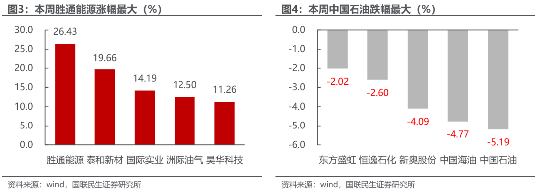 本周胜通能源涨幅最大。截至1月9日,石油石化行业中,公司周涨跌幅前5位分别为:胜通能源上涨26.43%,泰和新材上涨19.66%,国际实业上涨14.19%,洲际油气上涨12.50%,昊华科技上涨11.26%。