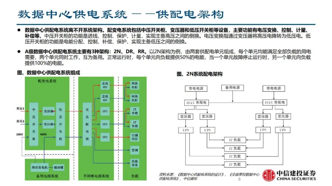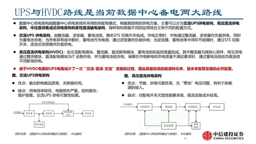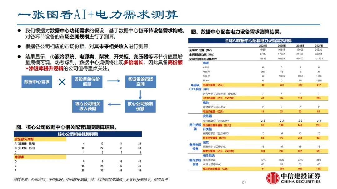 海外景气度投资核心是围绕增量变化及新技术投资,算力领域中电源功率密度随单芯片功耗大幅提升而提升,在使用机柜方案后,供电功率大幅增加,且国内自主可控,电源具备量价齐升 毛利率提升的通胀逻辑。电源产业链(国产电源、变压器、开关柜)有希望在25-26年在下游数据中心市场大幅增长驱动下获得估值和业绩的提升。同时智算需求将拉动新建机房需求,电力设备、温控设备是IDC机房建设中价值量占比较高的两个环节。