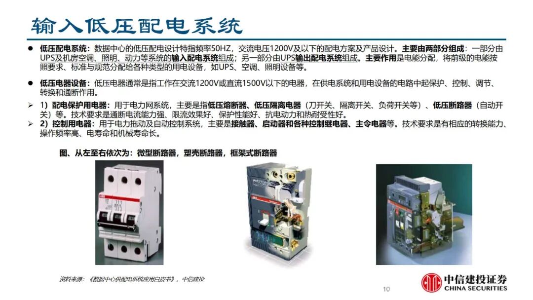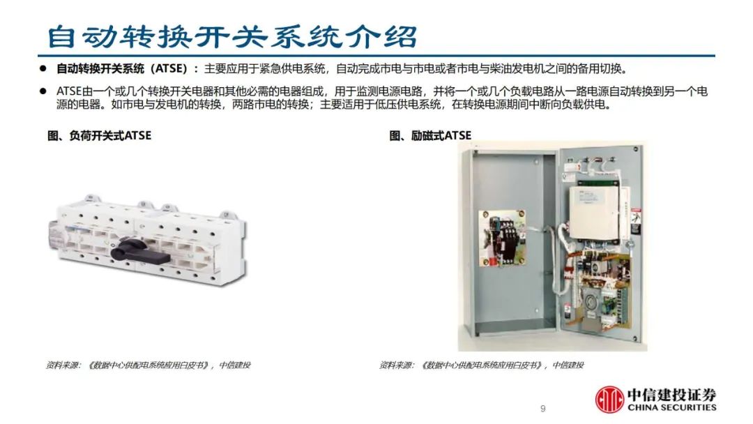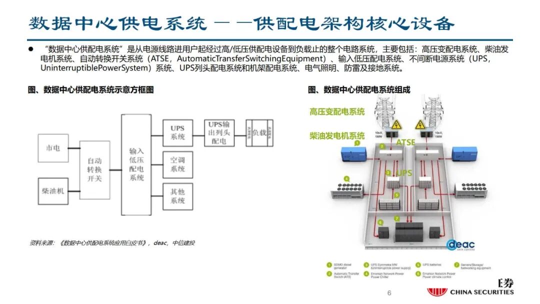 设备结构有哪些:“数据中心供配电系统”是从电源线路进用户起经过高/低压供配电设备到负载止的整个电路系统,主要包括:高压变配电系统、柴油发电机系统、自动转换开关系统(ATSE,Automatic Transfer Switching Equipment)、输入低压配电系统、不间断电源系统(UPS,Uninterruptible Power System)系统、UPS列头配电系统和机架配电系统、电气照明、防雷及接地系统。