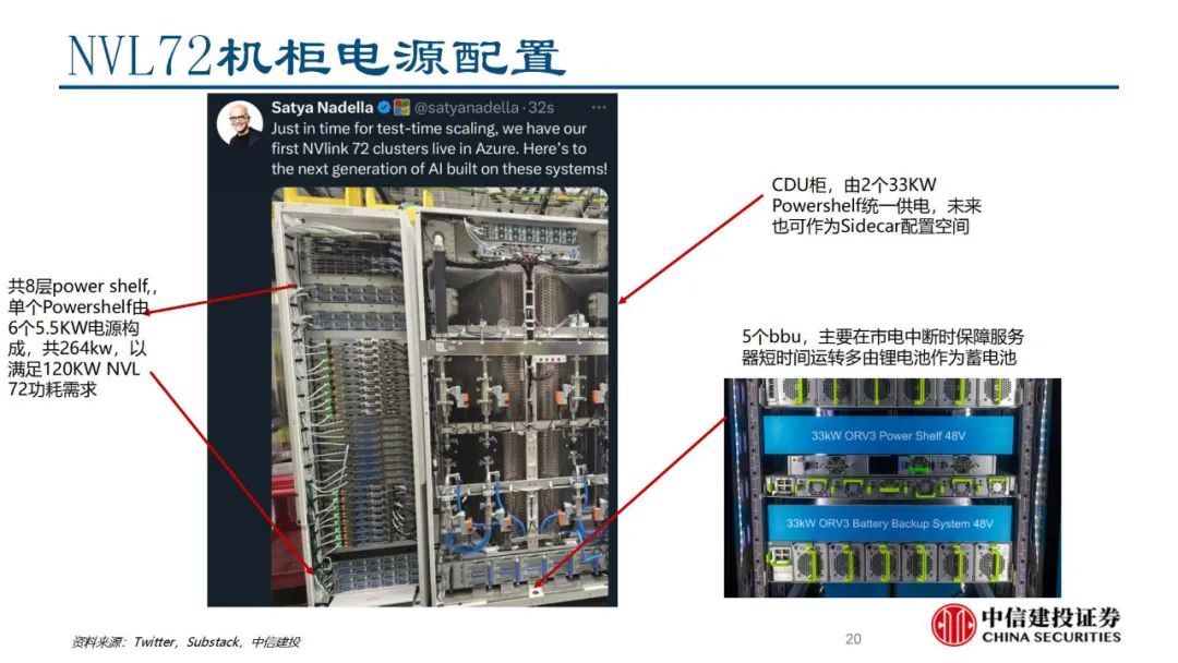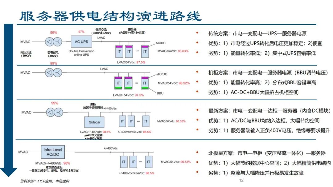 由于技术要求的不断提升,推动各产业链技术迭代,具备先发优势的企业可以享受超额利润。如随着计算芯片和服务器从DGX A100(芯片为A100)升级到NVL 72(芯片为B200),服务器电源方案从3kW(3 3)升级到33kW(3 3),而单瓦价格从0.3元/W提升到2元W,量、价齐升。从新能源角度来看,光伏电池技术从铝背场升级至PERC,再到TOPCon,以及目前的BC技术,每一轮技术升级过程中新技术均享受一定的单瓦溢价,这一情形与AIDC中供电密度的不断升级十分类似。