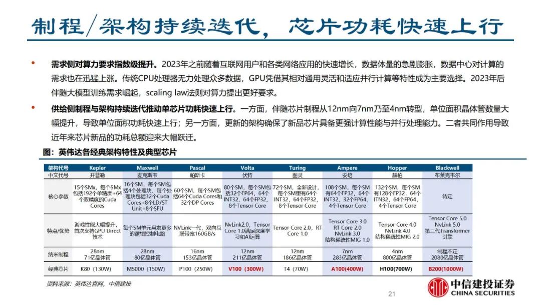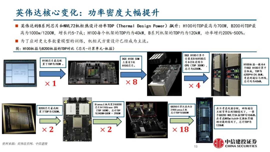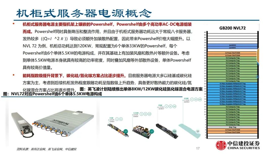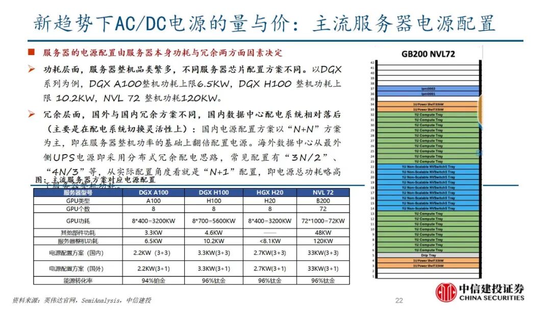 用电力换算力,重视海内外AI服务器电源投资机会。展望2025年,我们认为算力领域投资分为海外景气度投资以及国内自主可控两大类,这两大类中电源、散热都将受益海内外的产业趋势。第一,海外景气度投资核心是围绕增量变化及新技术投资:其中铜连接、液冷、电源变化最大,其中电源功率密度大幅提升,英伟达的H100芯片的TDP最高为700W,B200的TDP最高为1200W,单芯片功耗大幅提升。其次H100每个机架的TDP约为40kW(4组H100的八卡服务器),而B系列机架的TDP约为120kW,在使用机柜方案后,供电功率大幅增加。而且为了应对更大参数量模型的训练,机柜方案卡数之后还会更高,因此对PSU、电力配套设施未来仍会有新一轮的要求;第二,国内自主可控,同样电源也是核心。量价齐升 毛利率提升,电源带有通胀逻辑的方向。